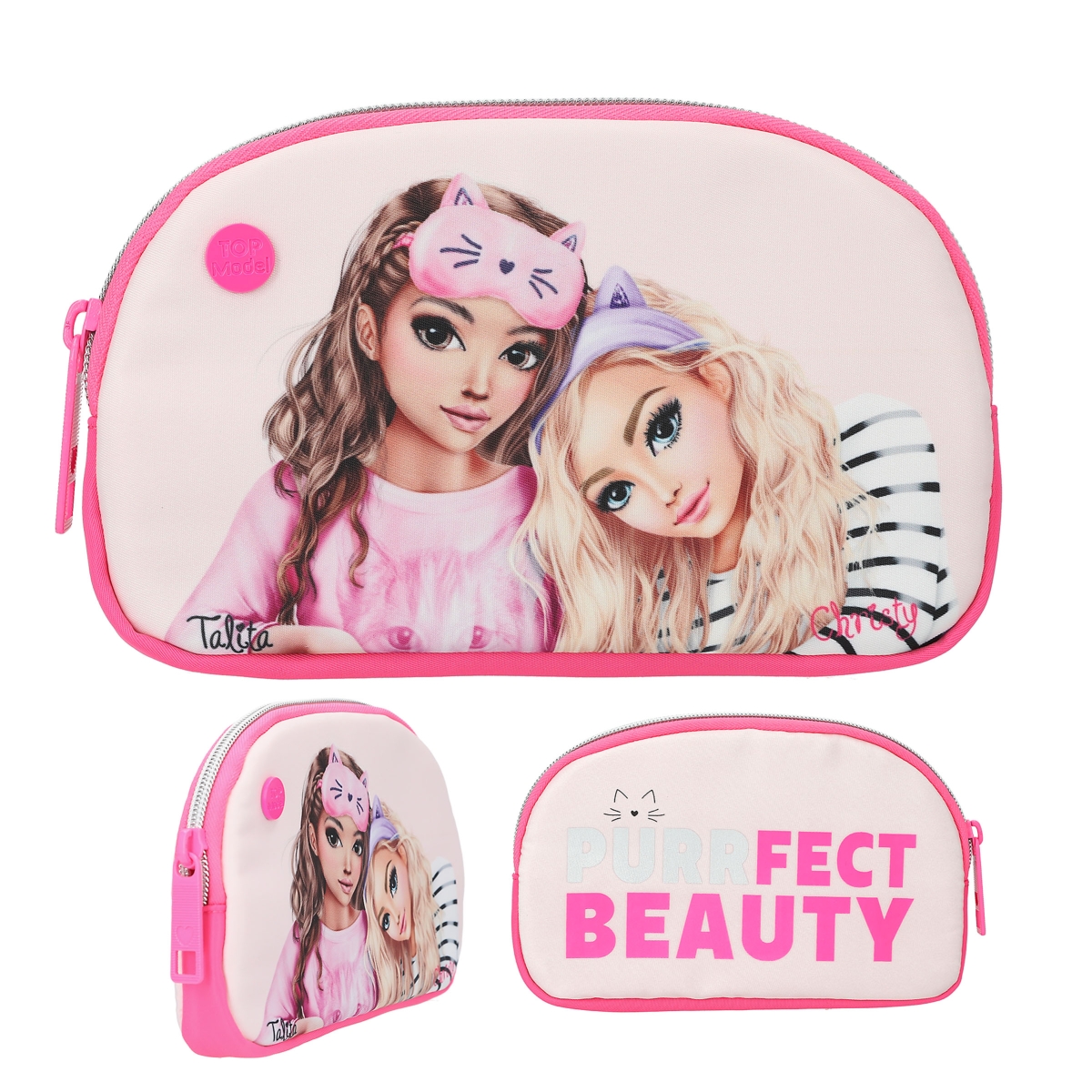 De kleine, platte roze TOPModel toilettas heeft neon roze details, een grote modellenafbeelding op de voorkant en op de achterkant tekst in een super coole neon en metallic look.